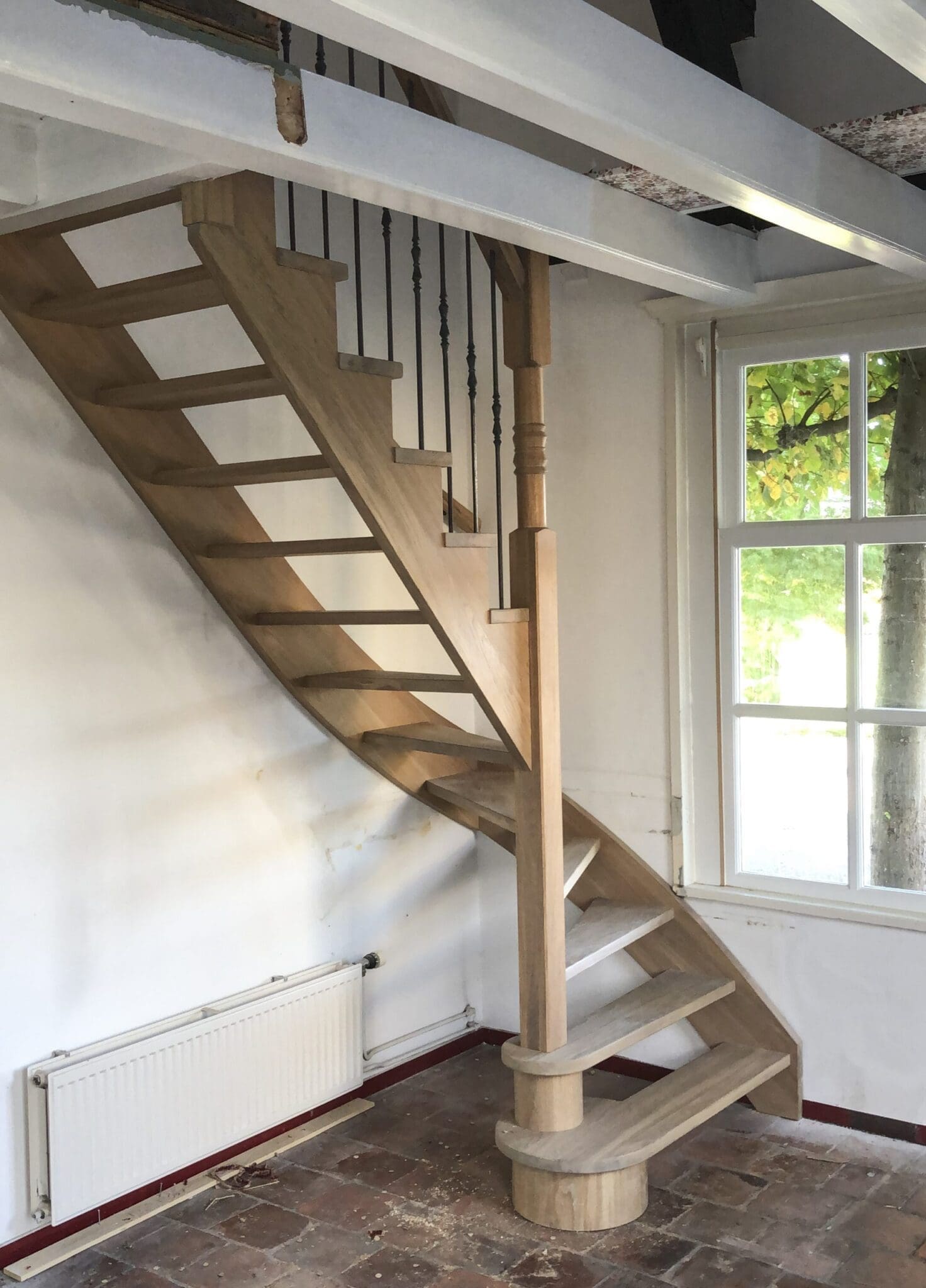 Deze kwartslagtrap is een rechte trap met aan de onderzijde een draai van 90 graden. De mooi afgeronde bloktreden aan de onderkant geeft een landelijk gevoel samen met de robuuste spil en zwarte spijlen.