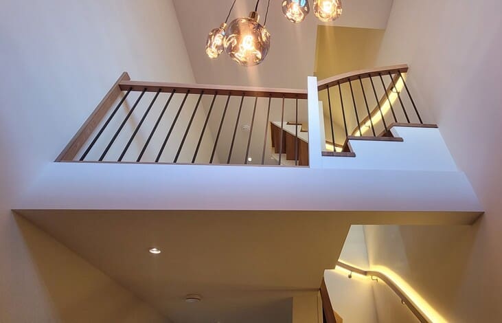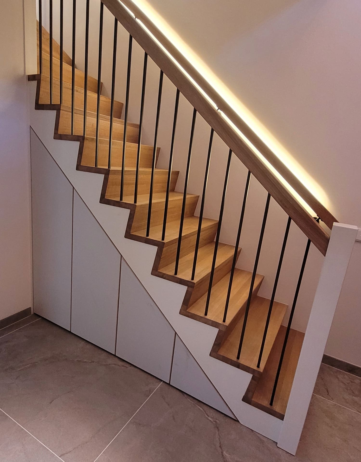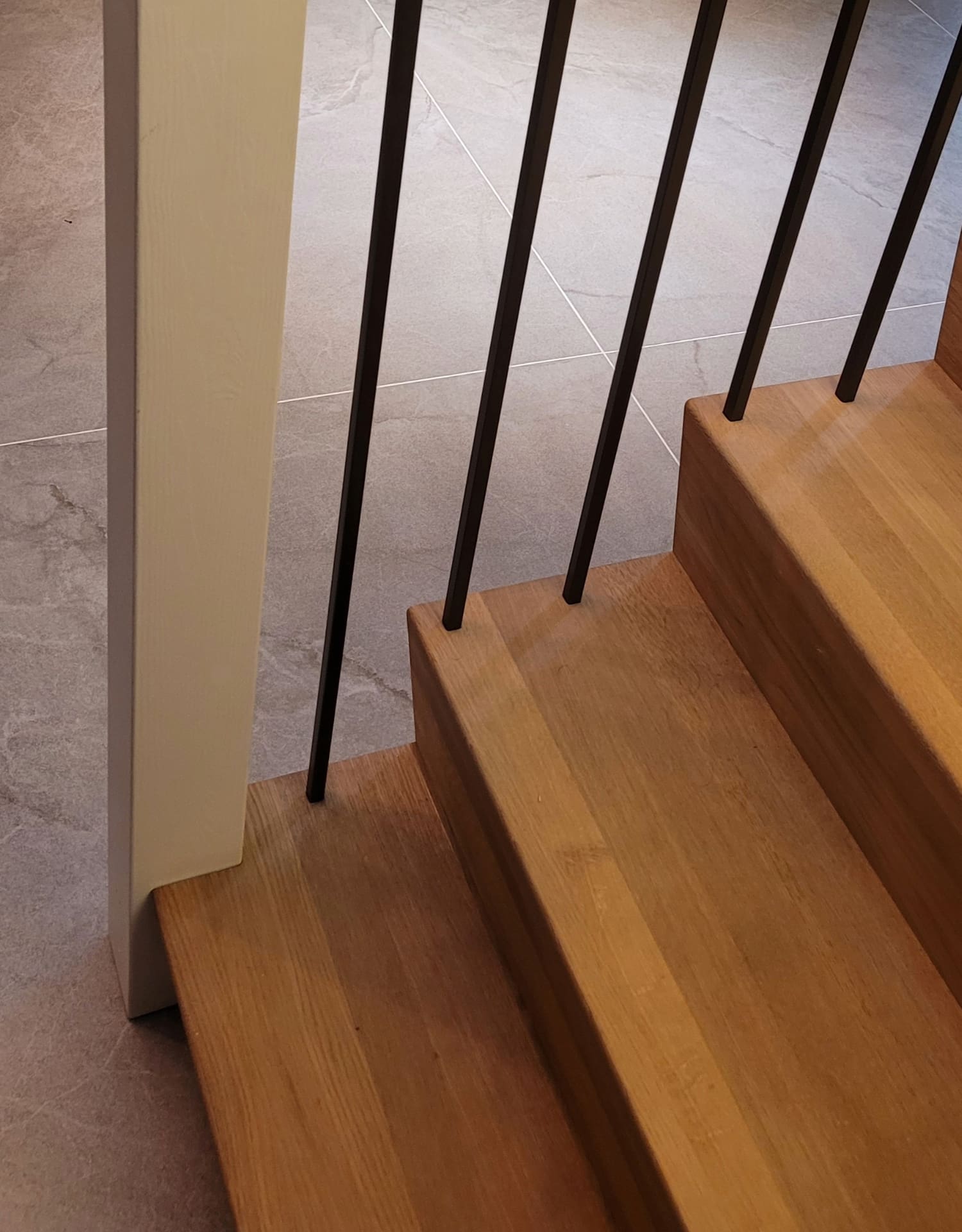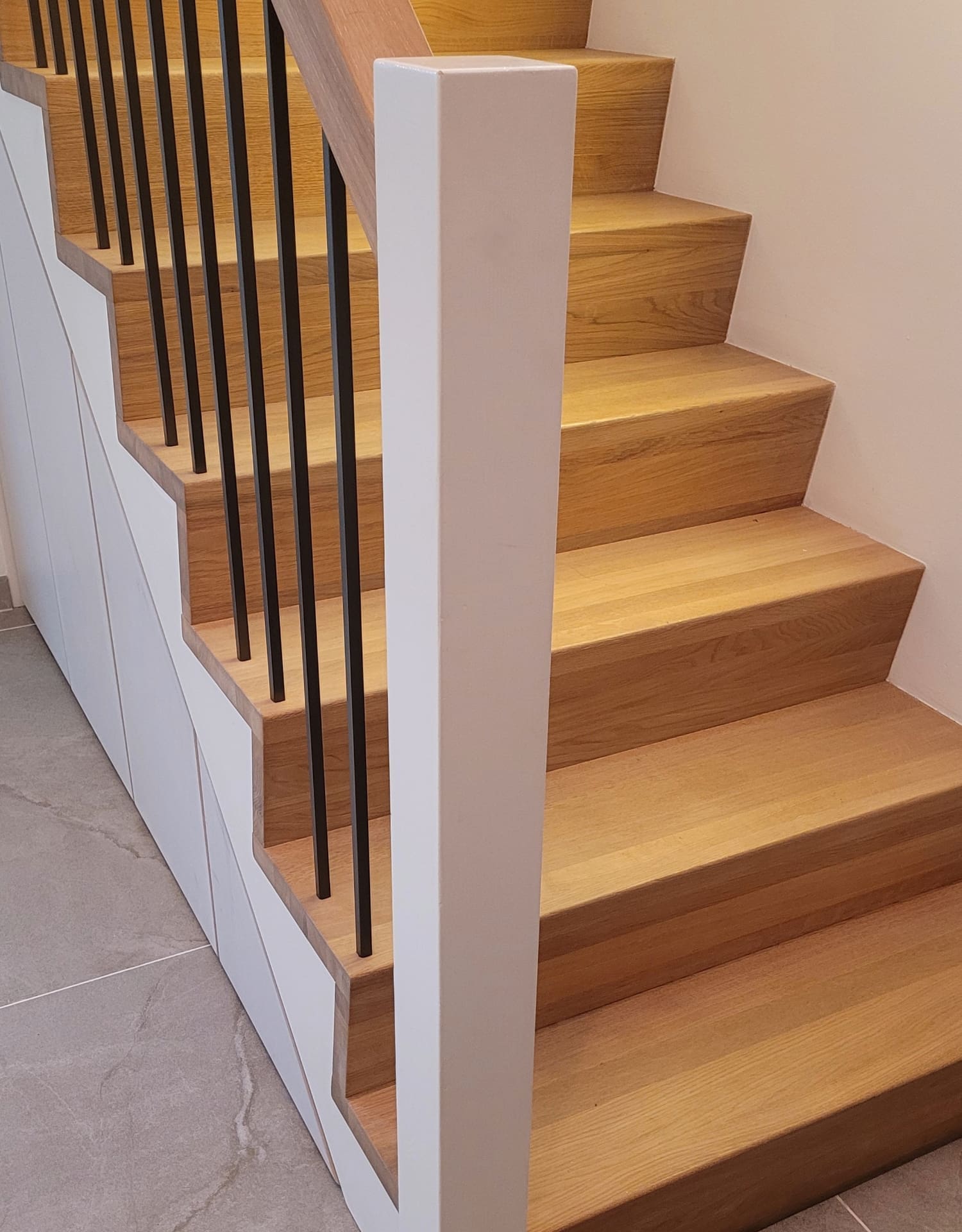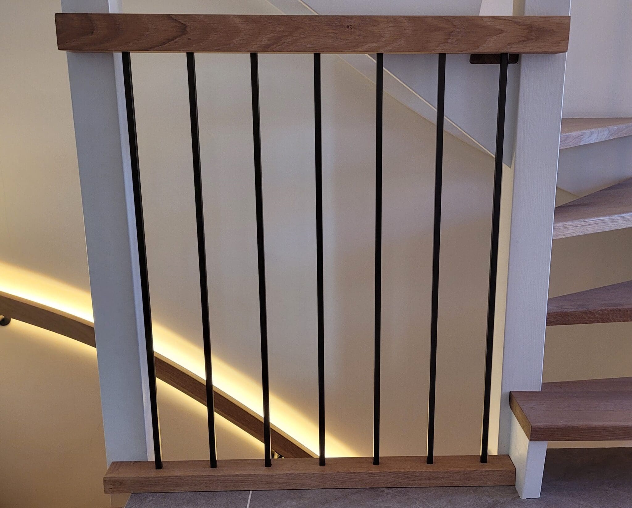 Deze kwartslagtrap is een rechte trap met aan de bovenzijde een draai van 90 graden. De trap is uitgevoerd in een Keepboom variant, met dichte treden vervaardigd in Eikenhout. De verstopte boom is gemaakt van Rubberwood en wit gegrond. Net als de Spillen van alle hekwerk. Deze super moderne trap heeft in de rechthoekige leuningen, led verlichting. Wij hebben daarvoor de leuningen aan de binnenkant uitgefreesd. Zo kon de klant zelf naar wens verlichting plaatsen. Al het hekwerk is voorzien van vierkanten spijlen. De Spijlen zijn gepoedercoat in de kleur Anodic Brown. Een hele mooie warme, bruine kleur. Wat deze trap ook bijzonder maakt is het hekwerk boven de trap. Deze loopt prachtig over in de 2de trap in deze woning. Ook gemaakt door CPI trappen. Kijk hier om de andere trap te bekijken: Keepboom Dubbelkwart trap Eiken