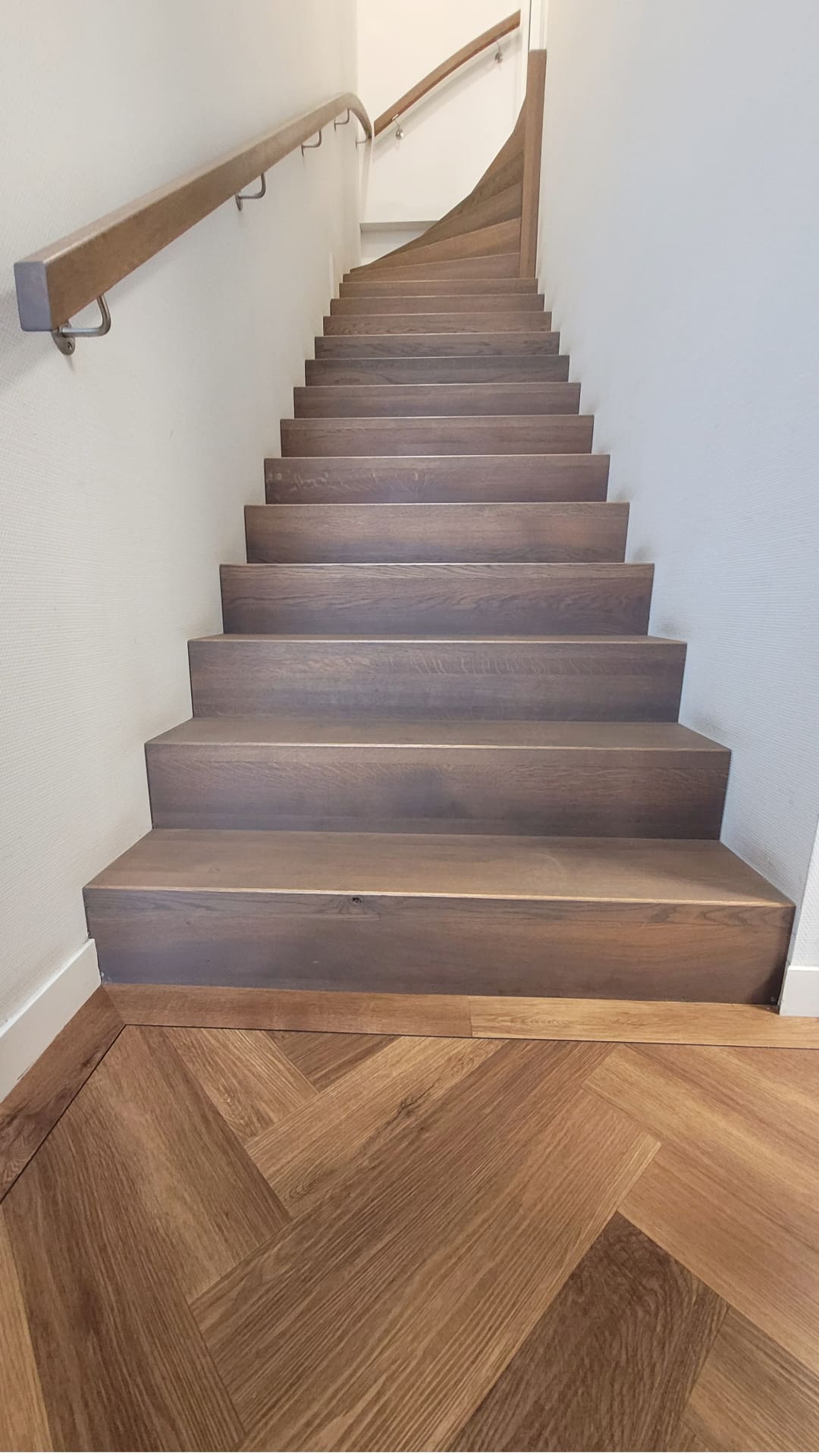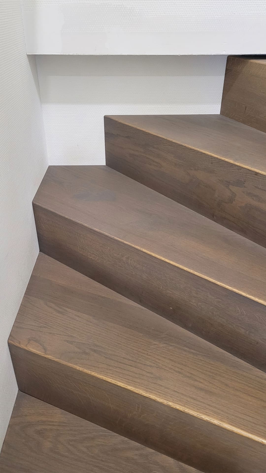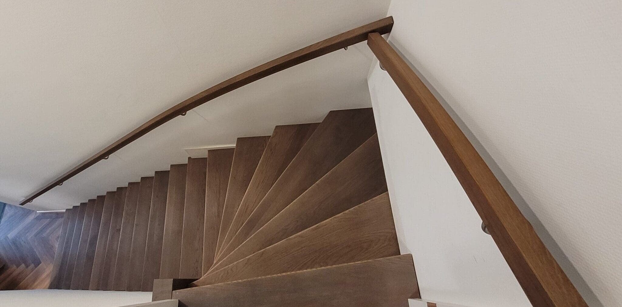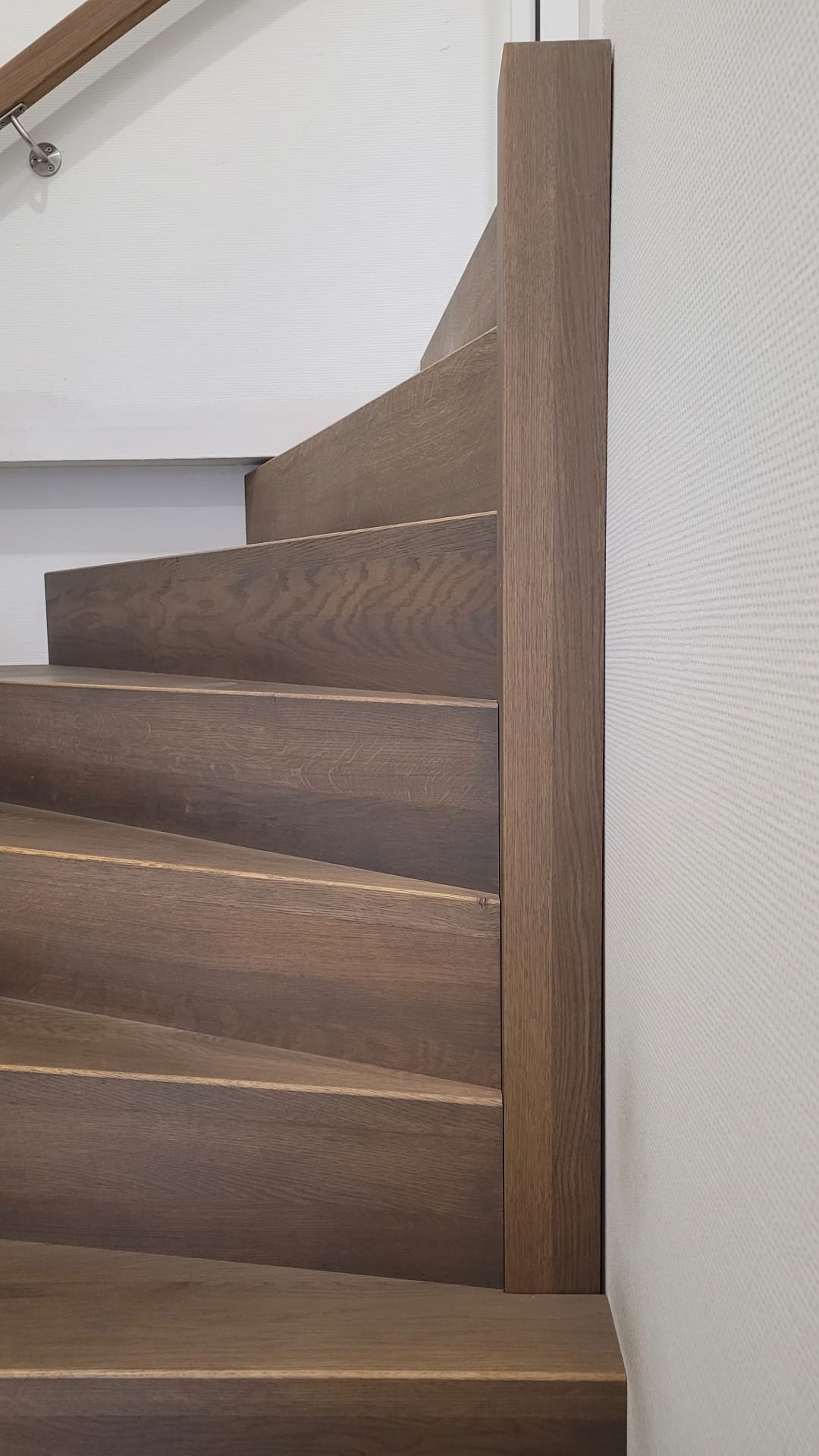 Deze kwartslagtrap is een rechte trap met aan de bovenzijde een draai van 90 graden. De trap is geplaats in een kantoorpand/loods. Deze Keepboom uitvoering is geheel in Eikenhout vervaardigd. De trap, inclusief rechthoekige leuningen, zijn behandeld met de kleur Chocolate olie. Van het merk Rubio Monocoat, waar CPI trappen op dit moment mee samenwerkt. De verstopte bomen zijn van Rubberwood gemaakt. Doordat de trap rechte keepboom treden heeft, geeft dit een strak en moderne look.
