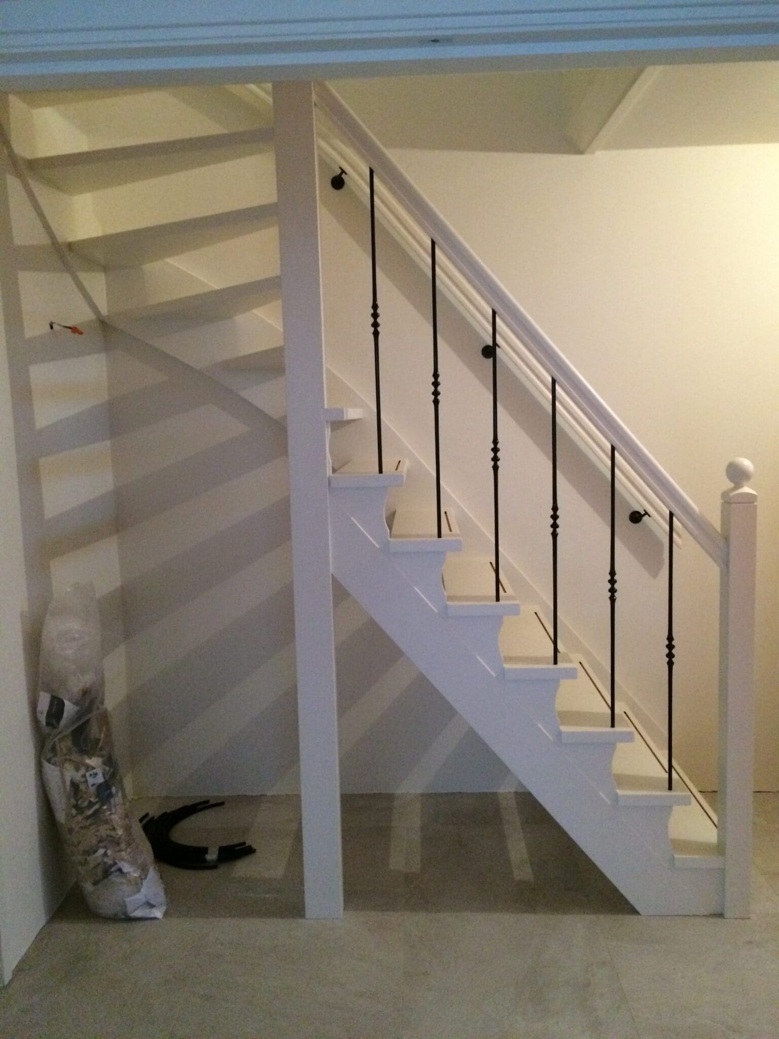 Deze kwartslagtrap is een rechte trap met aan de bovenzijde een draai van 90 graden. Door het witte design en zwarte afstekende spijlen is het een echte eyecatcher in uw woning.
