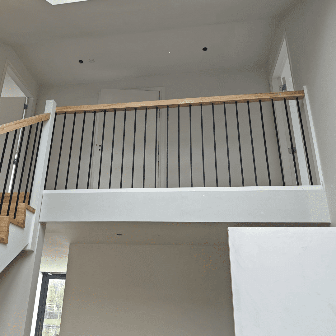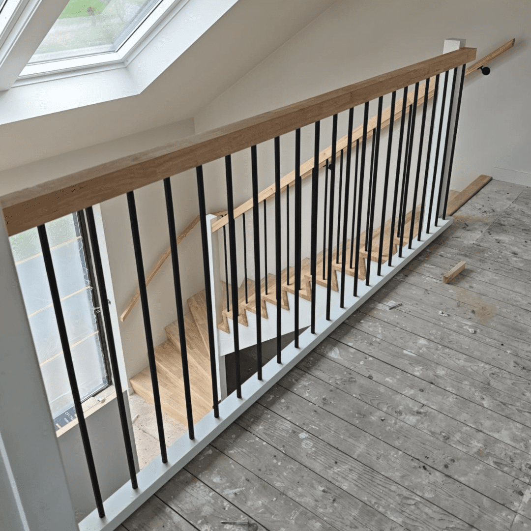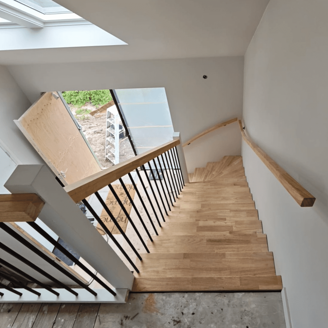 Deze kwartslagtrap is een rechte trap met aan de onderzijde een draai van 90 graden. Ook wel een Onderkwart genoemd. De trap is volledig vervaardigd uit Rubberwood hout. Deze trap is modern doordat de trap op Keepbomen is gemaakt. De trap is behandeld in een mooie olie kleur van Rubio Monocoat in de kleur Mist 5%. De bomen en spillen zijn wit gegrond en dienen nog te worden afgelakt. De vierkante leuningen worden afgemaakt door zwarte, leuningdragers. De balustrade op de trap en op de verdieping wordt afgemaakt met vierkanten, metalen spijlen.