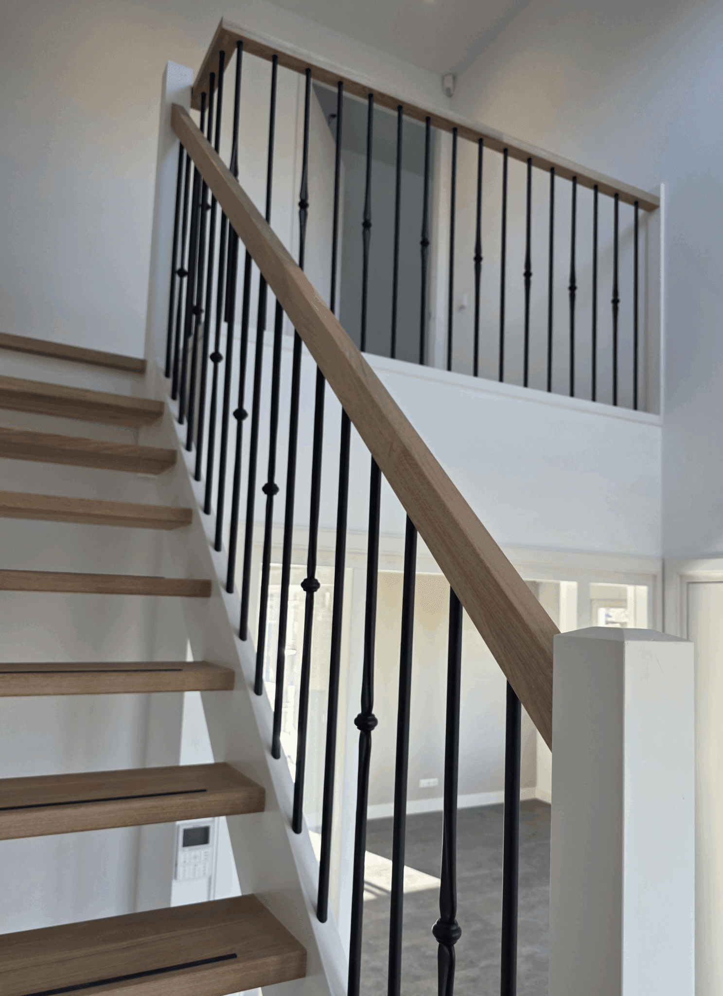 Deze kwartslagtrap is een rechte trap met aan de onderzijde een draai van 90 graden. Vandaar zijn naam ‘Onderkwart’. Alleen de treden zijn van Eikenhout gemaakt. De bomen en spillen zijn van Rubberwood gemaakt. Dit zijn allebei hardhout soorten. De treden hebben een olie behandeling van Rubio monocoat in de kleur Super White en de overige onderdelen zijn wit voorgegrond en door de bewoners zelf wit afgelakt. De eerste trede is een bloktreden. Dit geeft een mooie klassieke look aan de trap. Doordat de leuningen vierkant zijn, geeft dit de trap meteen een modern tintje. Afgemaakt met zwarte leuningdragers. Op de trap is ook nog een traphekje geplaatst. De spijlen zijn om en om bewerkt. De ene spijl is alleen rond en de andere spijl heeft een mooie knoop erin verwerkt. Allebei zijn de spijlen van metaal met een zwarte poedercoating. Om meer grip te krijgen heeft dezer trap antislip strippen op de treden.