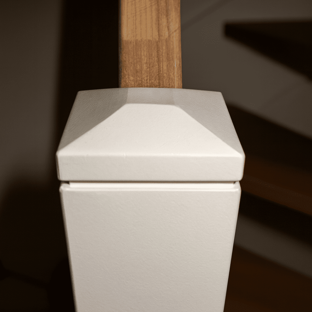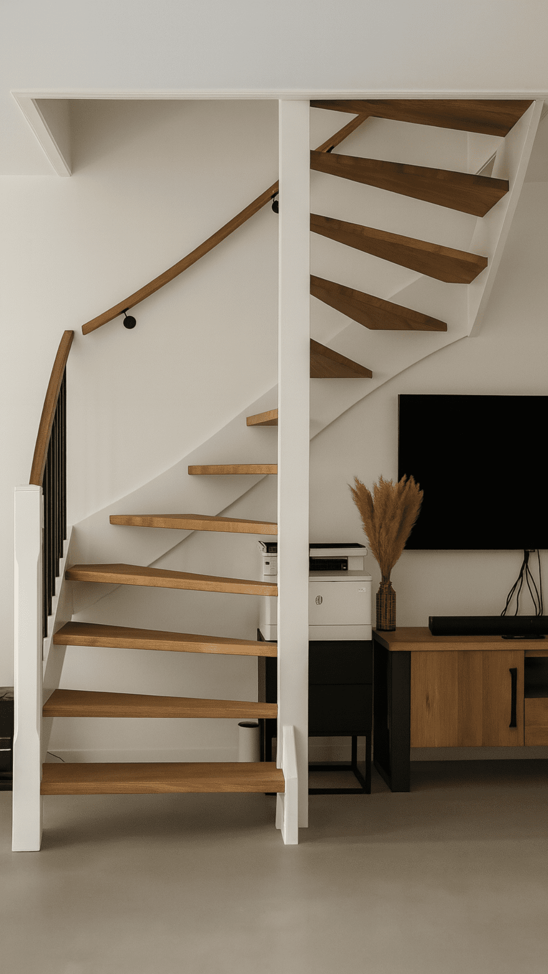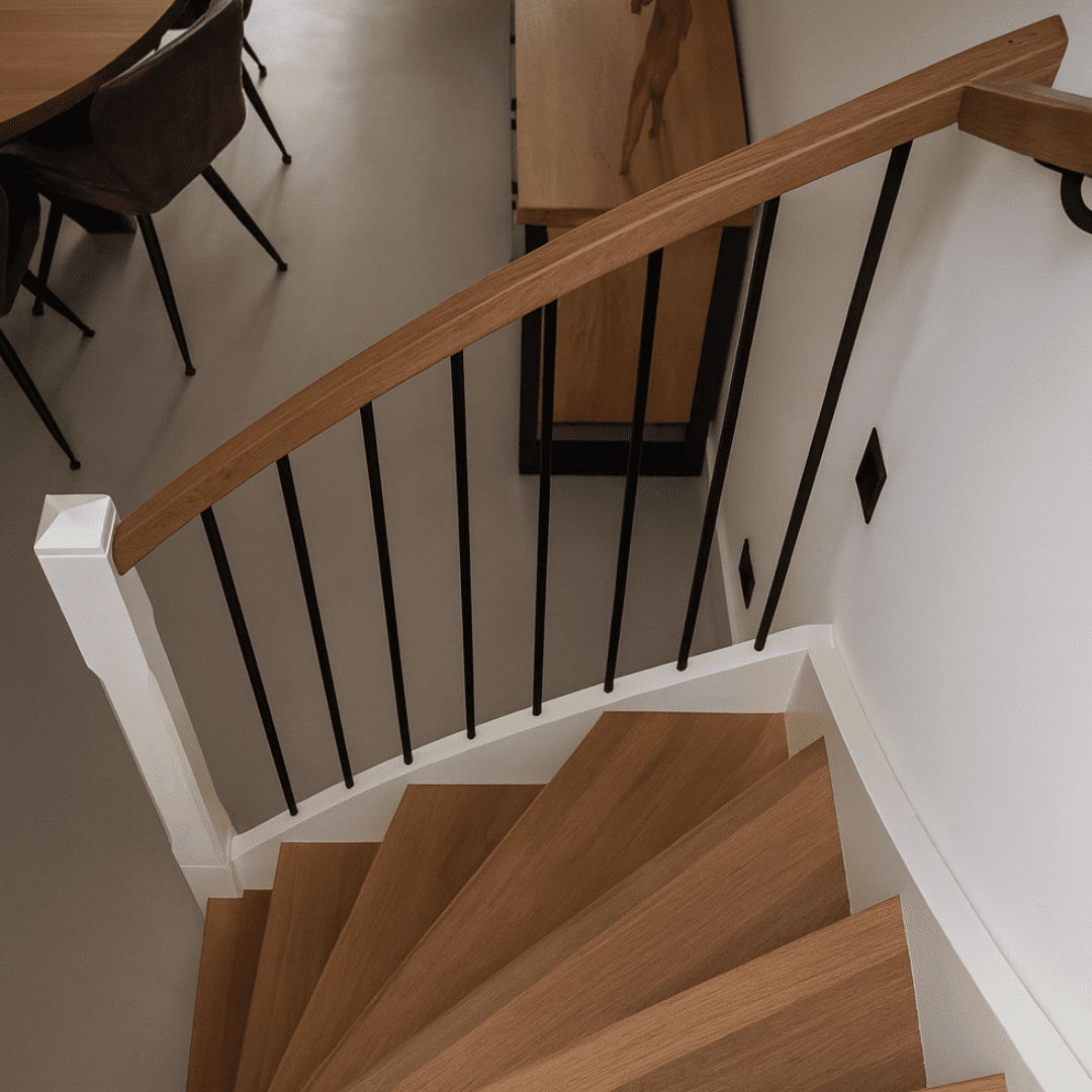 Deze open trap van Eikenhouten treden en Rubberwood bomen en spillen heeft een mooie Halveslag. Dit wil zeggen dat de twee kwarten recht boven op elkaar komen. Dit geeft de mogelijkheid voor een ruimtebesparende trap. De treden hebben een olie behandeling van Rubio monocoat in de kleur Mist 5% en de overige onderdelen zijn wit voorgegrond en door de bewoners zelf wit afgelakt. Bij deze trap zijn er vierkanten muurleuningen gemaakt met zwarte leuningdragers. Die weer mooi passen bij de spijlen van het hekje op de trap. Dit zijn ronde, metalen spijlen. De witte Hoofdspil van deze trap is met een klassiek werkje erin en heeft een klassiek petje erop.